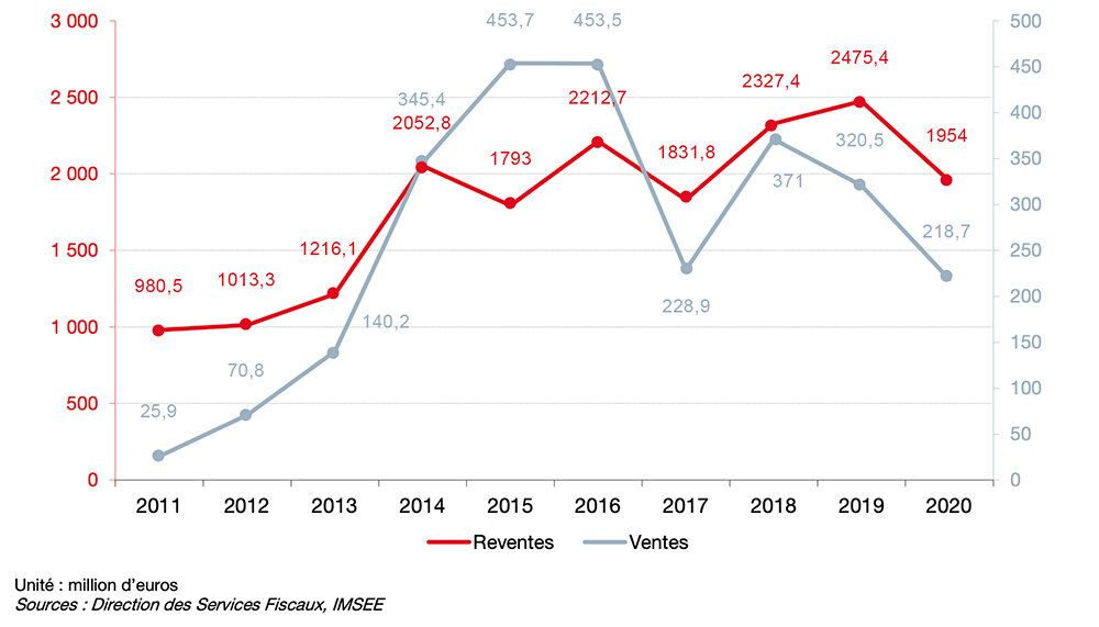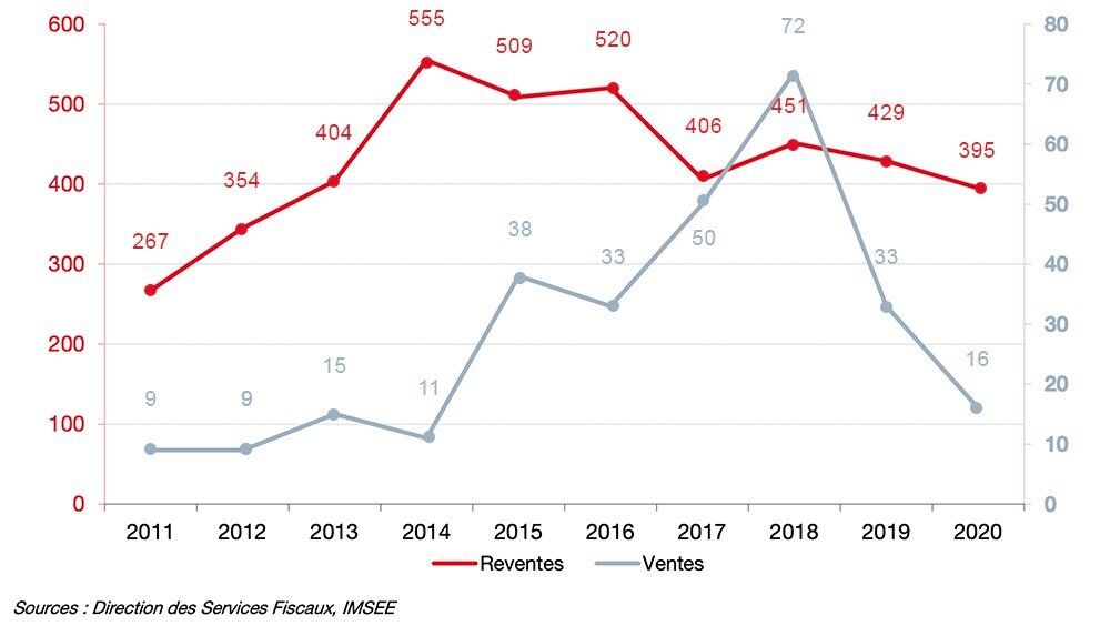In line with the observations on the slowdown in the number of sales and resales, the volume of property transactions also dropped sharply, both in terms of sales and resales (€2,172.6 million). This represents a decrease of 22.3% compared to 2019 (€2,795.9 million) and is comparable to 2017 (€2,060.7 million).