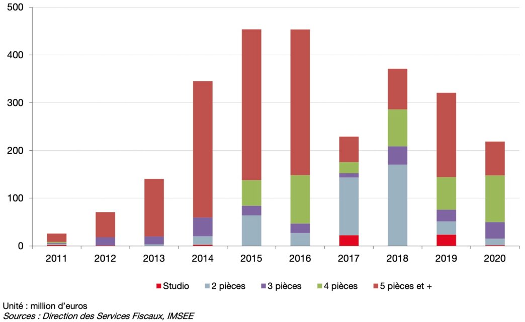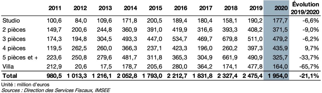 Total sales reached 218.7 million in 2020 against 320.5 million in 2019, or 453.7 million, which was the best year in 2015. However, we can see that the evolution of this very exclusive market in terms of offers is in fact very volatile. It only depends on the nature of the constructions to come or delivered, the developers having no difficulty in finding buyers during the marketing phases. In particular, it is uncorrelated with the resale market, which more accurately reflects the economic reality of the Monegasque residential property sector.