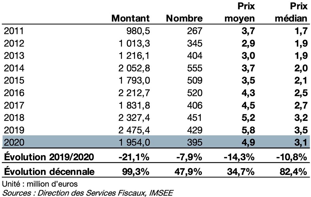 The median price also fell from €3.5 million in 2019 to €3.1 million in 2020. However, it has resisted better than the average price, which has certainly been significantly influenced by some very high transactions, particularly in 2019, which did not recur in the same proportions in 2020.