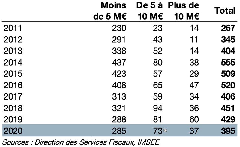 The number of transactions for amounts of less than €5 million remained at 285 instead of 288 in 2019. Proportionally, however, as the total number of resales fell, these transactions represented 72.2% of the total number of apartments resold in 2020 compared to 67.1% in 2019.