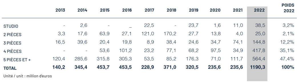 With the exception of 4-bedroom properties, which are down slightly by €33.4 million compared with 2021, all other types have seen their overall volume increase. Although villas accounted for only 9 transactions, compared with 7 in 2021, their total value more than doubled (+115%).
