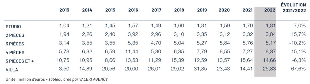 In 2022, only the 2-bedroom and 4-bedroom plus flats will record a fall in their average price compared with 2021, of which 10.2% for 3-bedroom flats, even though this is the type that has seen the strongest increase in the number of resales. On the other hand, 1-bedroom and 3-bedroom apartments have seen the biggest increase in their average price, up by 15%. Villas broke all records, with a 67.6% increase in their average price to reach an average of €25.83 million. As the analysis of villas is based on just 9 transactions, it is difficult to draw any conclusions. However, we can assume that as villas become rarer and rarer, their price will naturally rise, and that some of them will be able to be demolished to make way for ambitious new developments, thus fetching high prices.