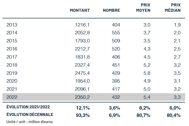 For the first time, the sales market have broken the symbolic billion euro barrier (€1.19 billion), which is 4 times more than the total for 2021! The previous records were set in 2015 and 2016, when sales totalled €453 million, just 38% of the new figure.