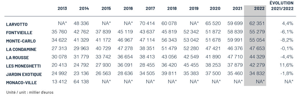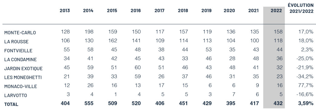 Fontvieille, which has been in vogue for a number of years, has stabilised its popularity, with only one additional transaction recorded (44 vs. 43 in 2021). La Condamine, which reported the strongest growth in 2021 (+71.4% compared with 2020), has seen a sharp drop this year (-25%). As for Jardin Exotique, the number of transactions continues to fall, becoming the lowest in 10 years.