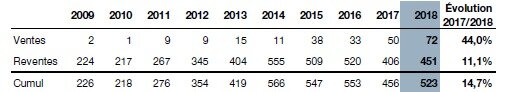 While the numbers of sales and resales evolved in the same direction before 2014, this trend has not been confirmed since then, in particular when we are looking at the year 2017. Nevertheless, the number of resales rose again in 2018 (+14.7%) with a total of 523 transactions.