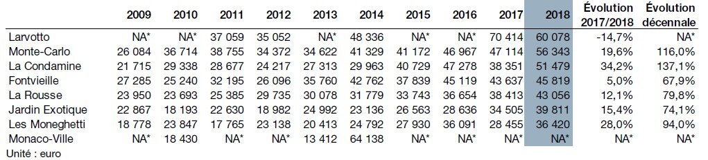 Only six neighborhoods have enough transactions to calculate the price per square meter every year. It is in Monte Carlo, with 56,343 Euros per square meter, that it is the highest. On the other hand, the lowest price per square meter is in the Jardin Exotique (36,420 €/m²).