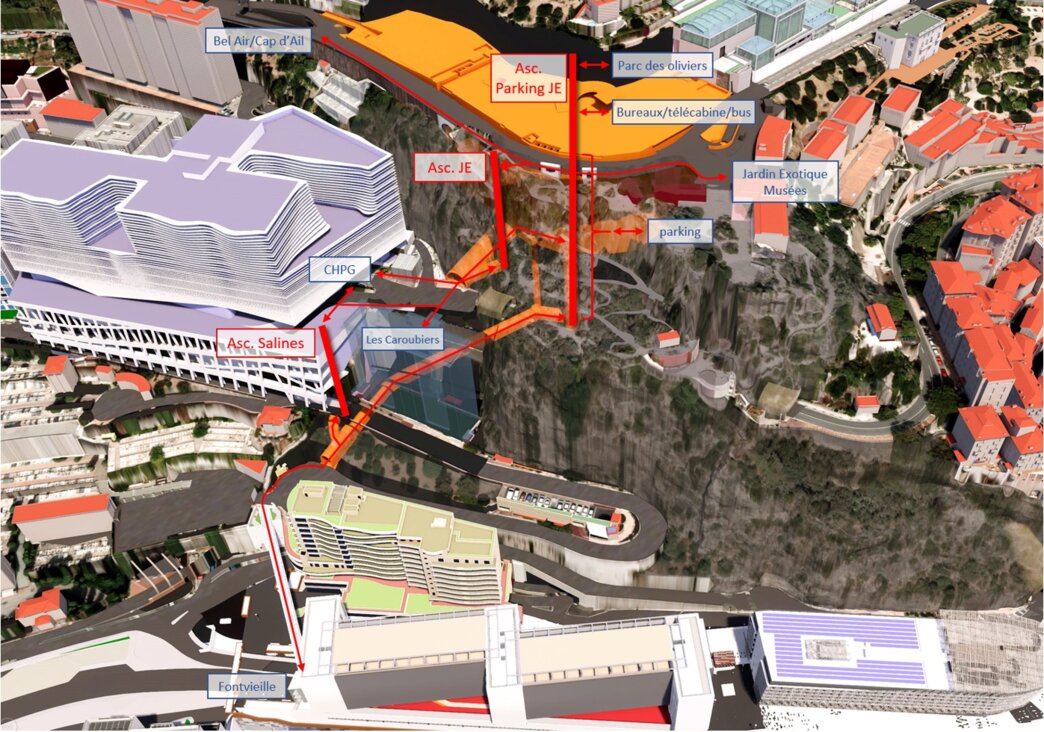 Cette galerie permettra de relier à pied le quartier du Jardin Exotique et le nouveau Centre hospitalier Princesse Grace au quartier de Fontvieille (via l’Ilot Pasteur, en cours de construction). Actuellement distants horizontalement d’environ 310 mètres à vol d’oiseau et verticalement par une différence d’altitude de 120 mètres. Le projet consisterait à relier une galerie souterraine de 110 mètres et une passerelle aérienne de 190 mètres grâce notamment à une série d’ascenseurs installés aux deux extrémités de ce projet.