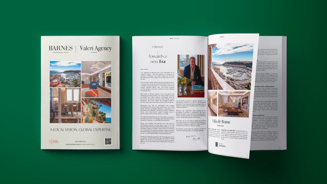 Découvrez le numéro 6 de notre magazine, le premier publié sous le nom Barnes | Valeri Agency ! Ce nouveau numéro marque un tournant dans notre histoire, avec en point d’orgue une interview exclusive entre Florian Valeri, directeur de l'agence, et Thibault de Saint Vincent, président de Barnes, qui dévoilent les motivations et les ambitions derrière ce partenariat. Vous y retrouverez également des articles captivants sur l’actualité immobilière monégasque, un dossier complet sur les droits des bailleurs, ainsi qu’une sélection exceptionnelle de biens à la vente. Un incontournable pour rester à la pointe de l’immobilier à Monaco !