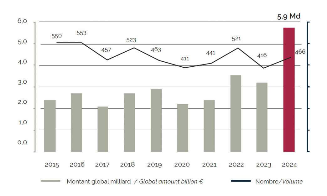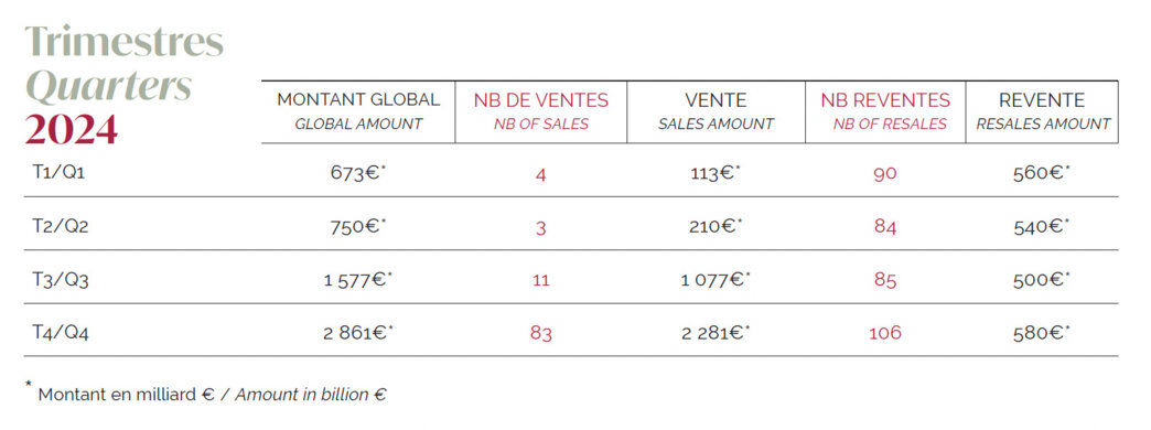 Corrélé à cette augmentation du nombre de transactions, mais encore plus significatif, le montant cumulé atteint un record historique de 5,9 milliards d’euros en 2024, soit une hausse de 82,6% par rapport à 2023 (3,23 milliards d’euros), les deux tiers du montant global provenant des ventes. Cette progression démontre que les transactions ont atteint des prix moyens plus élevés que les années précédentes.
