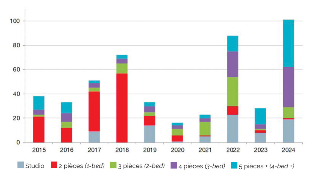 Parmi les unités vendues, une tendance marquante observée depuis 2022 : la demande pour les grandes typologies d’appartements. Plus de 70 % des ventes concernent des 4 pièces et plus, incluant les villas, soit 72 biens. Parmi les plus petites typologies, il faut savoir aussi que sur les 19 studios vendus, 18 étaient associés à des biens plus grands, souvent destinés au personnel de maison.