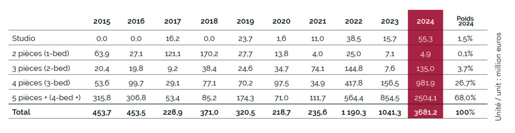 Cette dynamique marque un regain pour les 2 pièces et 3 pièces, qui avaient été les seules typologies à connaître une baisse en 2023. La demande pour ces formats semble s’être renforcée, notamment pour des acquisitions d’investissement ou des biens complémentaires aux grandes surfaces.