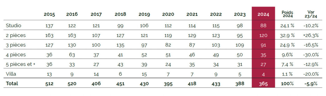 Avec 365 transactions en 2024, le marché immobilier de la revente enregistre pour la seconde année consécutive un recul (-5,9%) et atteint son niveau le plus bas depuis 2012.