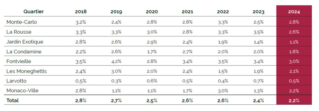 Contrairement à 2023, c’est le quartier de Fontvieille qui a enregistré en 2024 le plus haut roulement avec 3% des logements privés existants vendus. Le quartier de Monte-Carlo est toujours très dynamique et suit juste derrière, avec 2,8%.