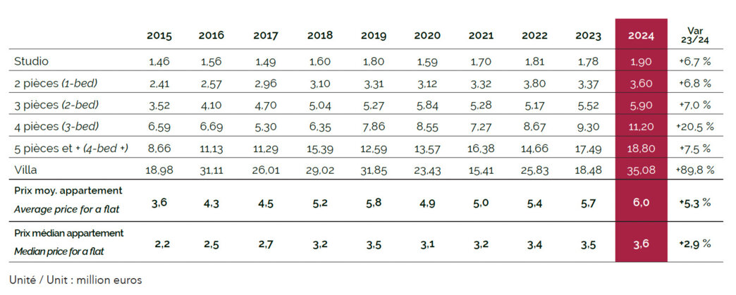 Toutes les typologies ont vu leur prix moyen augmenter. Ce sont les plus petites typologies, studios et 2 pièces, qui enregistrent la plus faible hausse (+6,7%) pour atteindre respectivement 1,9 million d’euros et 3,6 millions d’euros. C’est le prix moyen des 4 pièces qui connait l’augmentation la plus importante avec une hausse de 20,5%. Par exemple, en 2024, le prix moyen d’un 4 pièces est de 11,20 millions d’euros. Les villas représentent un segment très particulier compte tenu de leur rareté et du faible nombre de références. Cette année, leur prix moyen a augmenté de 89,8%.