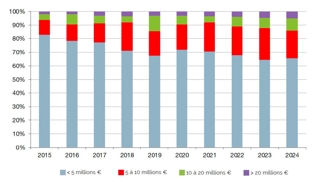 En 2015, les reventes de moins de 5 millions d’euros représentaient un peu plus de 80% du montant des transactions. En 2024, cette proportion est inférieure à 65%. En 10 ans, les transactions inférieures à 5 millions d’euros enregistrent une baisse de 43,6% avec 185 transactions en moins.
