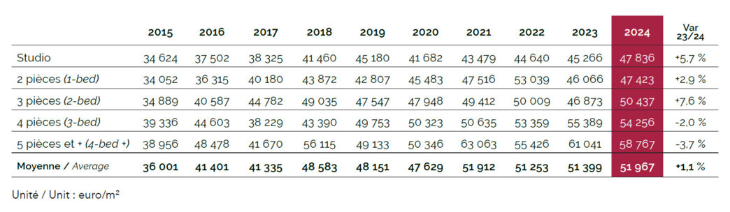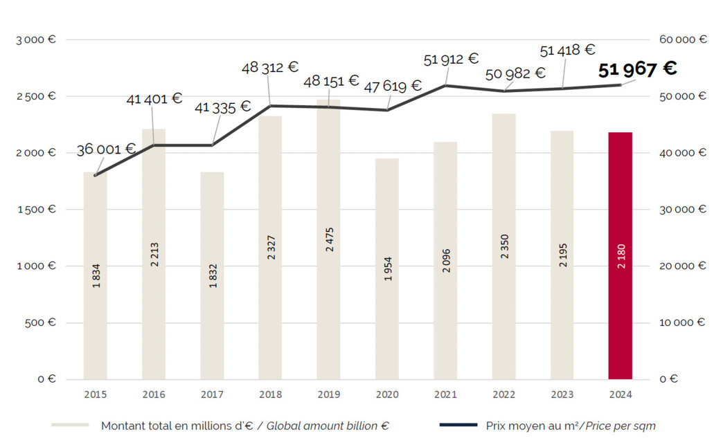 Parallèlement, le prix moyen au mètre carré suit une progression continue, passant de 37 242 €/m² en 2014 à 51 967 €/m² en 2024, soit une hausse de près de 40 %.