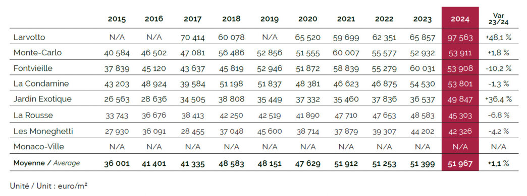 En 2024, le prix moyen au mètre carré atteint 97 563 €/m² au Larvotto, un record historique pour un quartier, avec une hausse de 48,1 %. Ce chiffre est à nuancer car il repose sur un volume limité de seulement six transactions ; cependant, il illustre l’exclusivité croissante du secteur. Historiquement composé en grande partie de résidences locatives, le Larvotto devrait voir son volume de transactions progresser avec l’intégration de Mareterra, tout en maintenant des prix parmi les plus élevés de la Principauté, si ce n’est les plus élevés.