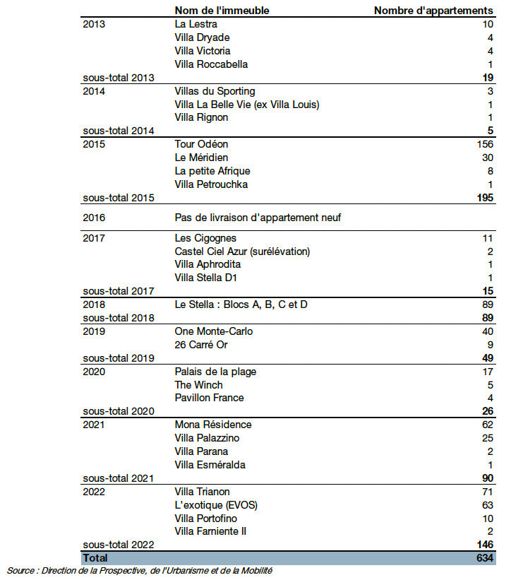 The delivery of new flats has increased considerably compared to 2021, with a total of 146 units, representing an increase of 62%. While the “Villa Portofino” and “Villa Farniente” represent just 12 units, the “45G” and “L’Exotique” residences account for 134 flats. Stella» and «Tour Odéon» are the only two buildings to have delivered more units in a decade. With the exception of the “Tour Odéon” in 2015 and 1993, this is the highest number of new flats delivered since 1992.
