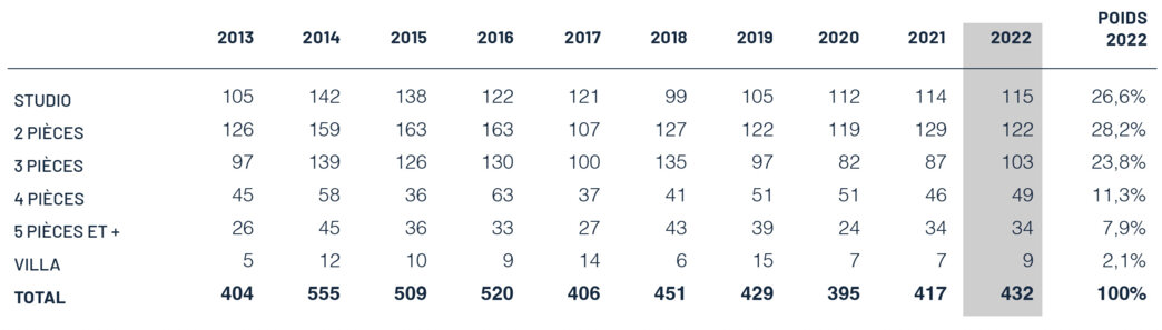 As in the sales market, 1-bedroom flats are the only type to have fallen. Studios and 1-bedroom apartments accounted for 232 resales, i.e more or less 54% of the flat types sold, as in 2020 and 2021.