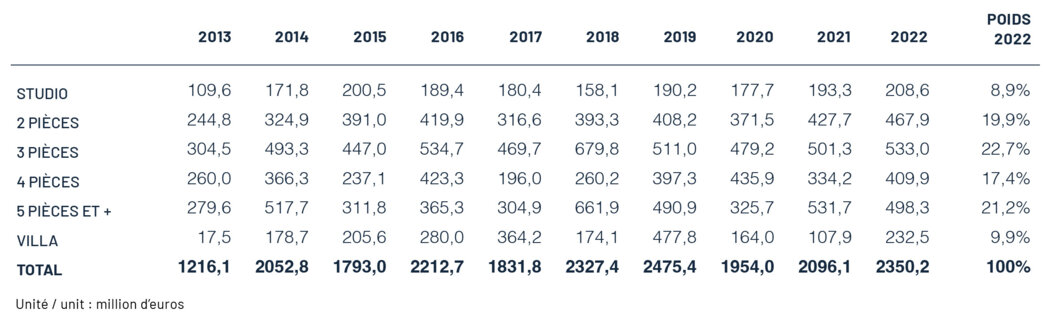With the exception of 4-bedroom properties, which are down slightly by €33.4 million compared with 2021, all other types have seen their overall volume increase. Although villas accounted for only 9 transactions, compared with 7 in 2021, their total value more than doubled (+115%).