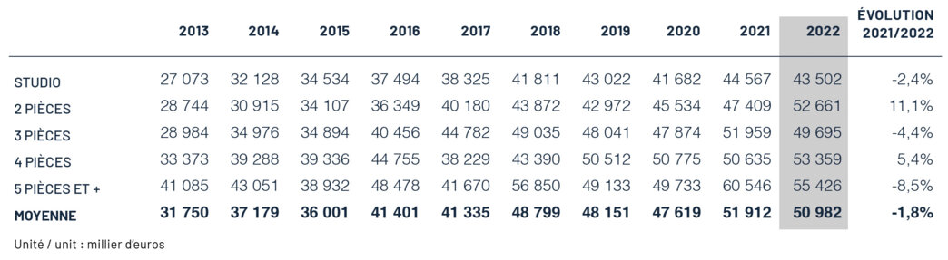 The price per square metre will have fallen by almost 2% compared with 2021, but remains above the symbolic €50,000 mark for the 2nd year running, with an average price of €50,982! The average price of all types of property has fallen, with the exception of 1-bedroom and 3-bedroom flats, which are breaking all-time records at €52,661/sqm and €53,359/sqm respectively. It is the 4-bedroom plus flats that are recording the sharpest fall (-8.5% vs. 2021), stabilising at a price similar to 2018. Prices for studios and 3-bedroom apartments are close to 2018/2019 levels.