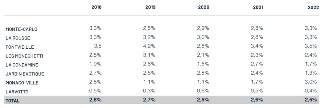 The Moneghetti district recorded the biggest increase (+11.6%) compared to last year.