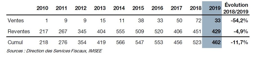 The numbers of sales and resales have been following the same trend since last year, and it continued in 2019, but this time downwards. The number of sales fell sharply (-54.2%) even if it has nevertheless remained at a relatively high level for the last 10 years, while the number of resales recorded a much less significant drop (-4.9%), with a total of 462 transactions.