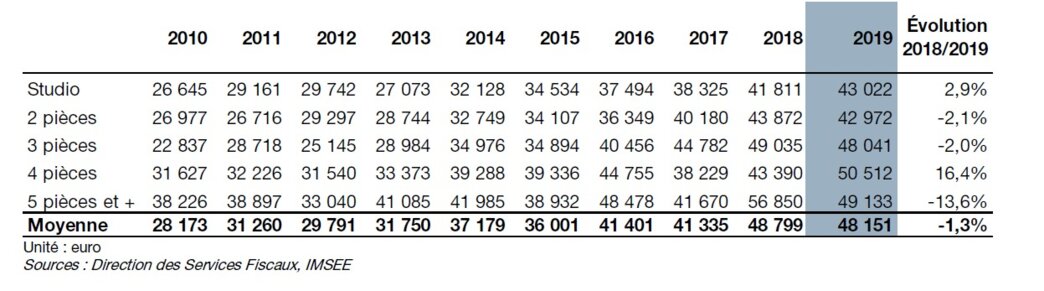 A stabilization of the average price per square meter was noticed between 2018 and 2019 with a value of 48,151 euros. It declined for all apartment types in 2019, except for studio and 4-rooms apartments. The highest volatility observed on large apartments, is also explained by the fact that the number of transactions is lower and therefore more fluctuating.