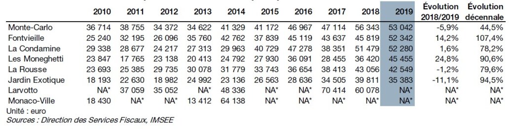 Only six districts have enough data to calculate the average price per square meter each year, which in 2019 exceeded € 52,000 in the Monte-Carlo, Fontvieille and Condamine districts. The Larvotto and Monaco-Ville districts have too few transactions data to be analyzed.