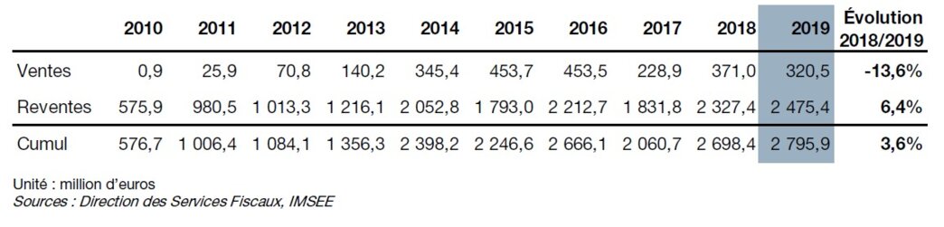 The total amount of sales and resales has been constantly above 2 billion euros since 2014 with a total of almost 3 billion euros in 2019, an historical record. However, there has been a stabilization phase since then, with fluctuations from year to year but much less than the exponential growth recorded between 2009 and 2014.