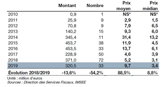In contrast, the amount of these sales represents € 320.5 million, a decrease (-14% compared to 2018) but much less marked than the number of transactions.