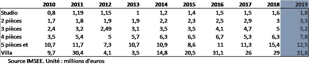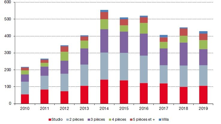 Regarding the resales market, there are 429 transactions, 22 less than in 2018 (-4.9%). Resales involving studios, two- and three-rooms apartments represent three-quarters of the market, the last quarter includes larger apartments. It is interesting to note that despite the difficulties encountered on the rental market with regard to studios, the number of sales continues to grow (going from 99 transactions in 2018 to 105 in 2019). Another point to highlight is the 15 villas sold in 2019, the highest total ever recorded since the creation of this observatory, and which have often been acquired for real estate development